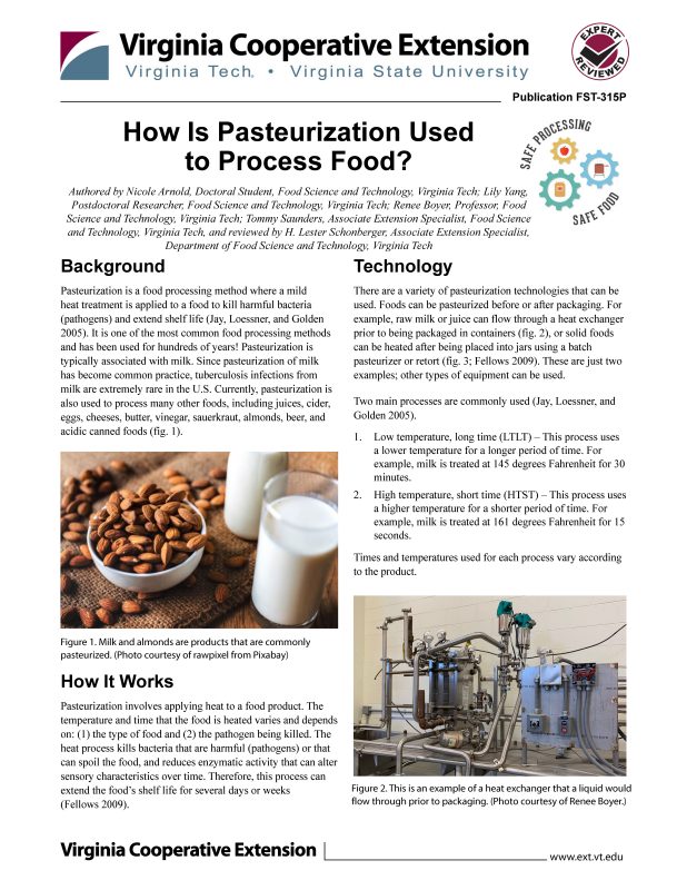 Pasteurization is a food processing method where a mild heat treatment is applied to a food to kill harmful bacteria (pathogens) and extend shelf life (Jay, Loessner, and Golden 2005). It is one of the most common food processing methods and has been used for hundreds of years! Pasteurization is typically associated with milk. Since pasteurization of milk has become common practice, tuberculosis infections from milk are extremely rare in the U.S. Currently, pasteurization is also used to process many other foods, including juices, cider, eggs, cheeses, butter, vinegar, sauerkraut, almonds, beer, and acidic canned foods (fig. 1).